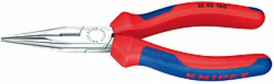 适于电子元件的夹持和剪切;尖形半圆嘴钳口;钳口表面带齿;剪切刀口适于剪切中硬线和硬线;刀口硬度约为洛氏硬度HRC61;长度140,头部镀铬,双色双重材料手柄