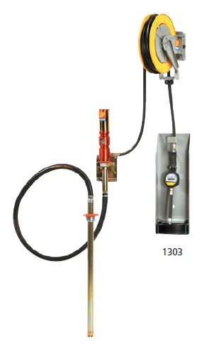ME1300用于180-220L油桶,配有: R=5:1bar气动提油泵 10m,R1 1/2” 提油软管卷盘 1.5m R1 1/2”内螺纹--内螺纹油管 数显流量计数提油喷嘴 接油盘