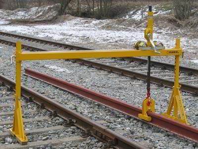 有两个支架,一个横梁,一个移动起重机和一个滚轴搬运钳